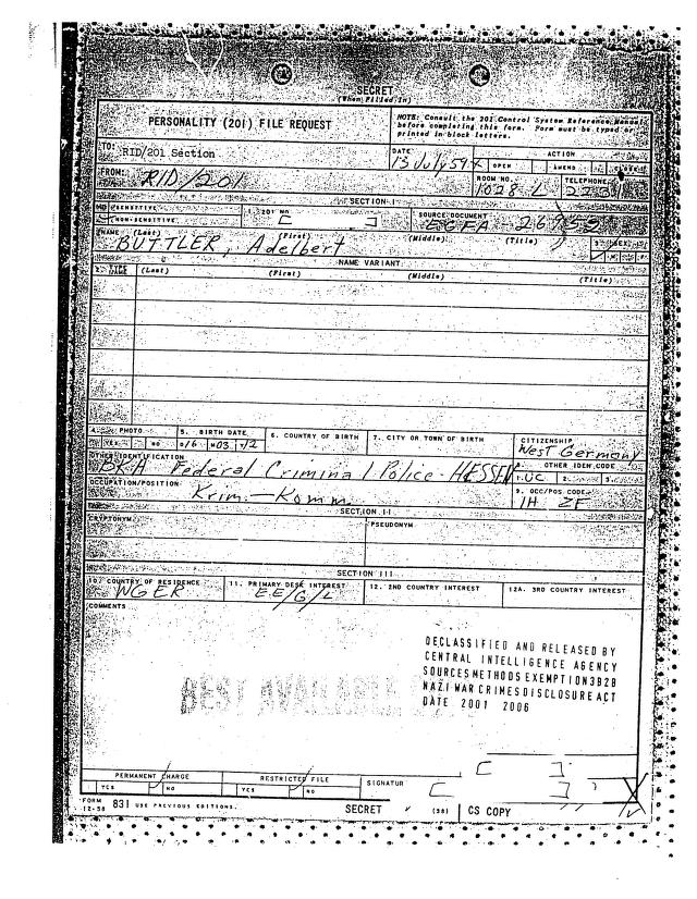 * 16.3.1912 Neumünster. Oberleutnant der Schutzpolizei, 1942 Kompanieführer des Polizei-Bataillons 315 (Pol.Btl. Brünn, Heimatstandort Halle) in der Ukraine, 1943 SS-Obersturmführer (SS-Nummer 350 521), bei Eingreiftruppe Piper der Höheren SS- und Polizeiführer OST zur „Partisanen“- und Judenbekämpfung eingesetzt. Nach 1945 Kriminaloberkommissar, Referatsleiter für Personenfeststellung im Bundeskriminalamt. Buttler wurde 1953 Gründungsvorsitzender der „Gewerkschaft der Polizei“ (GdP) im BKA. 1959 hat man Buttler bei der CIA überprüft, zu dieser Zeit war er laut CIA-Dokument „Krim.-Komm.“ beim BKA Hessen.